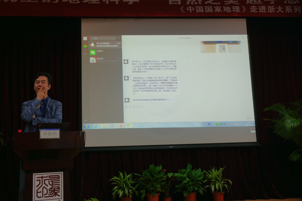 2015年11月2日晚,中国十大杰出出版人、中国科学院地理科学与资源研究所研究员、《中国国家地理》杂志社社长兼总编辑李栓科研究员莅临best365官网登录入口东方论坛玉泉分论坛“《中国国家地理》走进浙大—家园系列”讲座,为浙大师生带来了题为“景观里的地理科学——自然之美,超乎想象”的精彩演讲。本次讲座由best365官网登录入口圆正控股集团董事长胡征宇进行嘉宾介绍,由best365官网登录入口陈汉林教授担任主持。