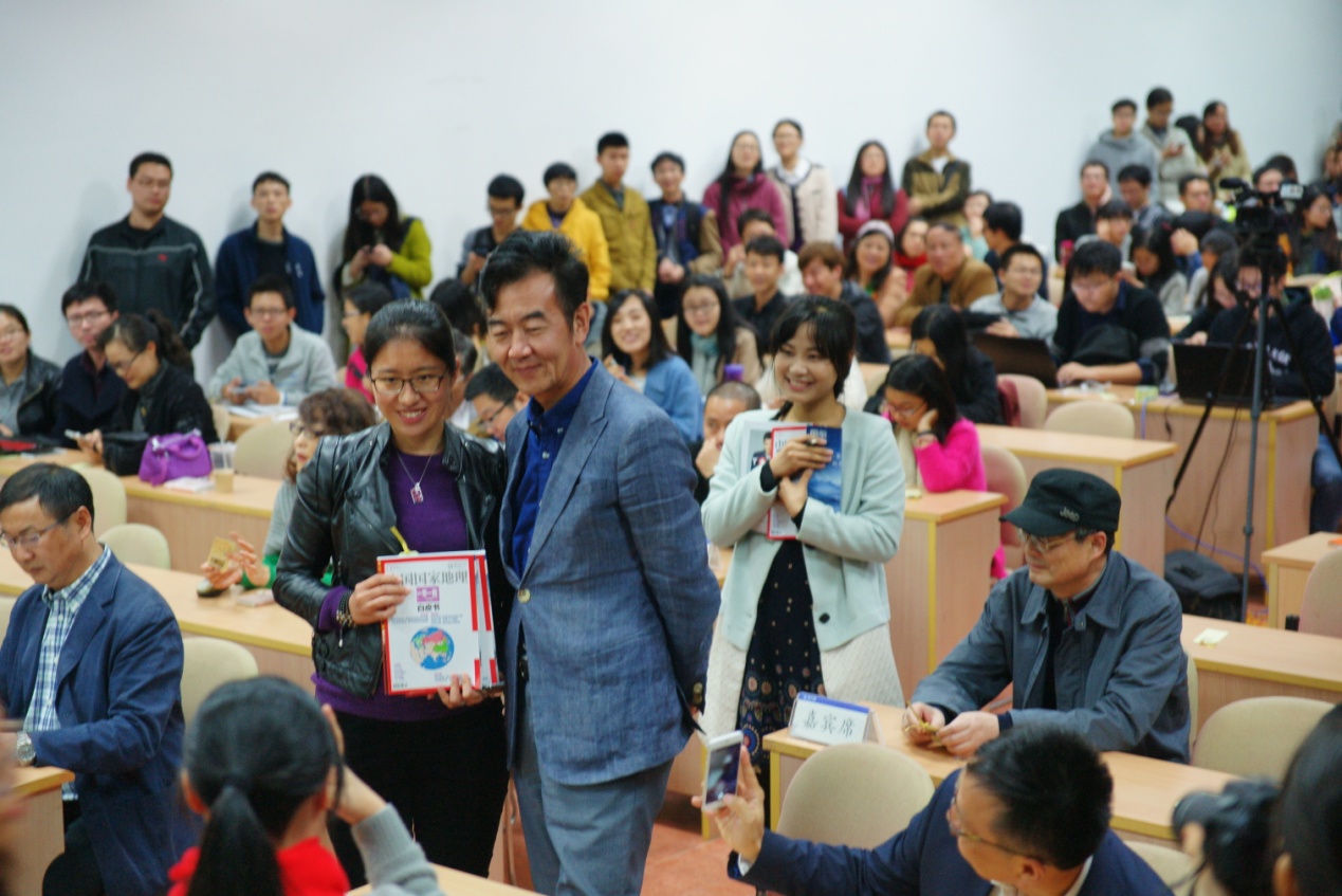 互动环节同学们争相提问,现场热烈万分,李栓科老师以其丰富的人生经验为大家细细解答,现场欢笑连连、掌声雷动。李老师还现场“悬赏”两个问题,鼓励大家头脑风暴,正确回答问题的同学获赠2016年全套《中国国家地理》杂志。
