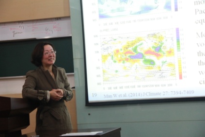 接下来是年会的主体部分,由四位老师和四位研究生分别就各自的研究领域进行了学术报告。在四位老师中,首先是毕磊教授对冰云光学特性研究领域的进展进行了介绍,接下来是由环资学院的高超超教授带来了题为《Volcanic Monsoon Influence Revealed from Multi-proxy Evidence》的报告,然后是田荣湘教授对太阳辐射和能量变化在青藏高原季节变化中的作用进行了介绍,而后是黄艳艳老师向大家介绍了西太平洋副热带高压的年代际变化。此外,还有段磊同学、葛敬文同学、苏涛同学和李婷婷同学分别就气候变化与地球工程、中国冬季降水的年代际变化、重力波触发新对流的特征以及梅雨降水系统发展过程中的正压过程等研究方向作了学术报告。
