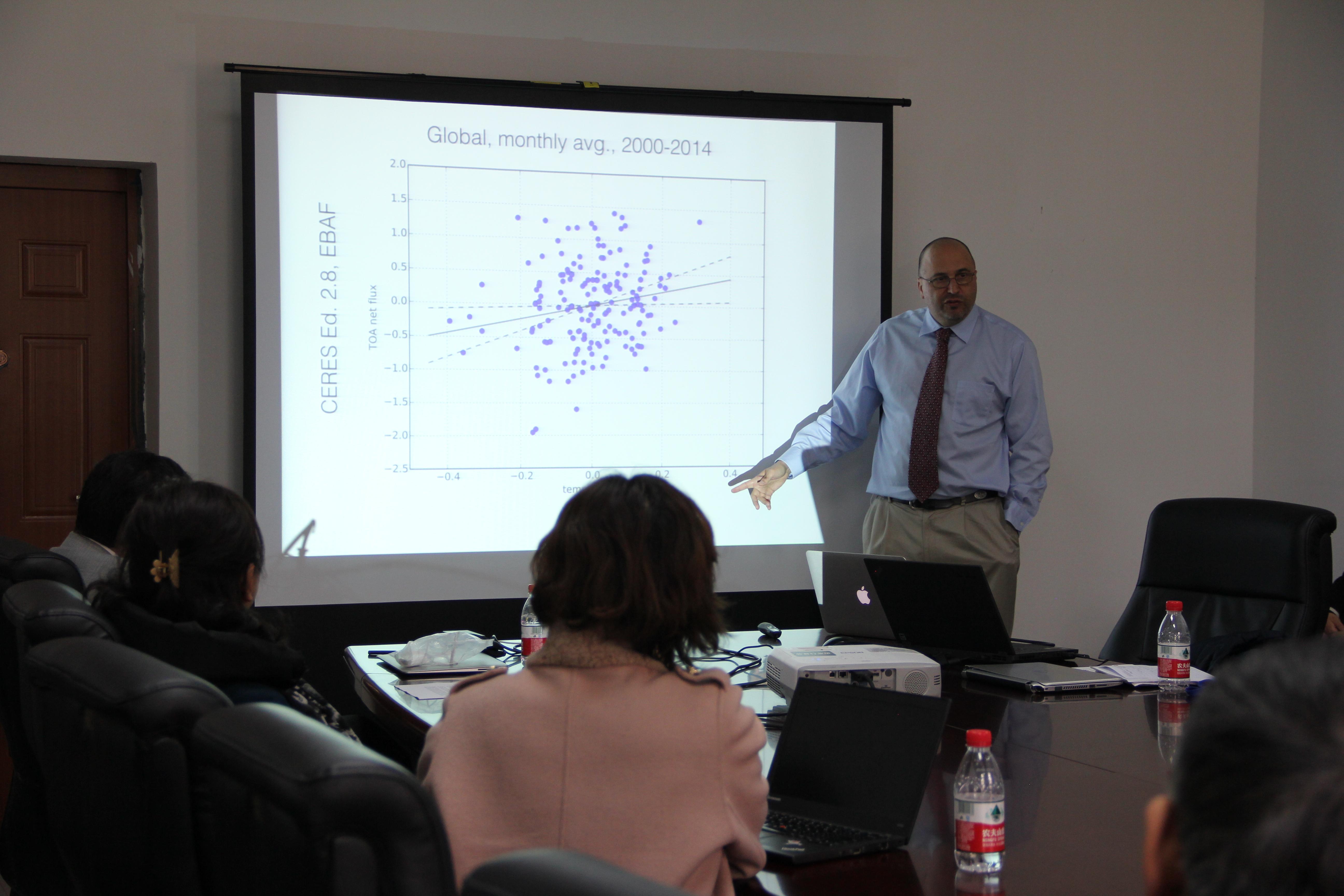 A.E.Dessler博士的报告以学术内容为主,题为“What we can learn about ECS from short-term climate variations”。A.E.Dessler博士从二氧化碳对温度的影响等角度切入,主要讲述了以线性拟合为基础的针对短期气候模拟从而预测长期气候的方法。