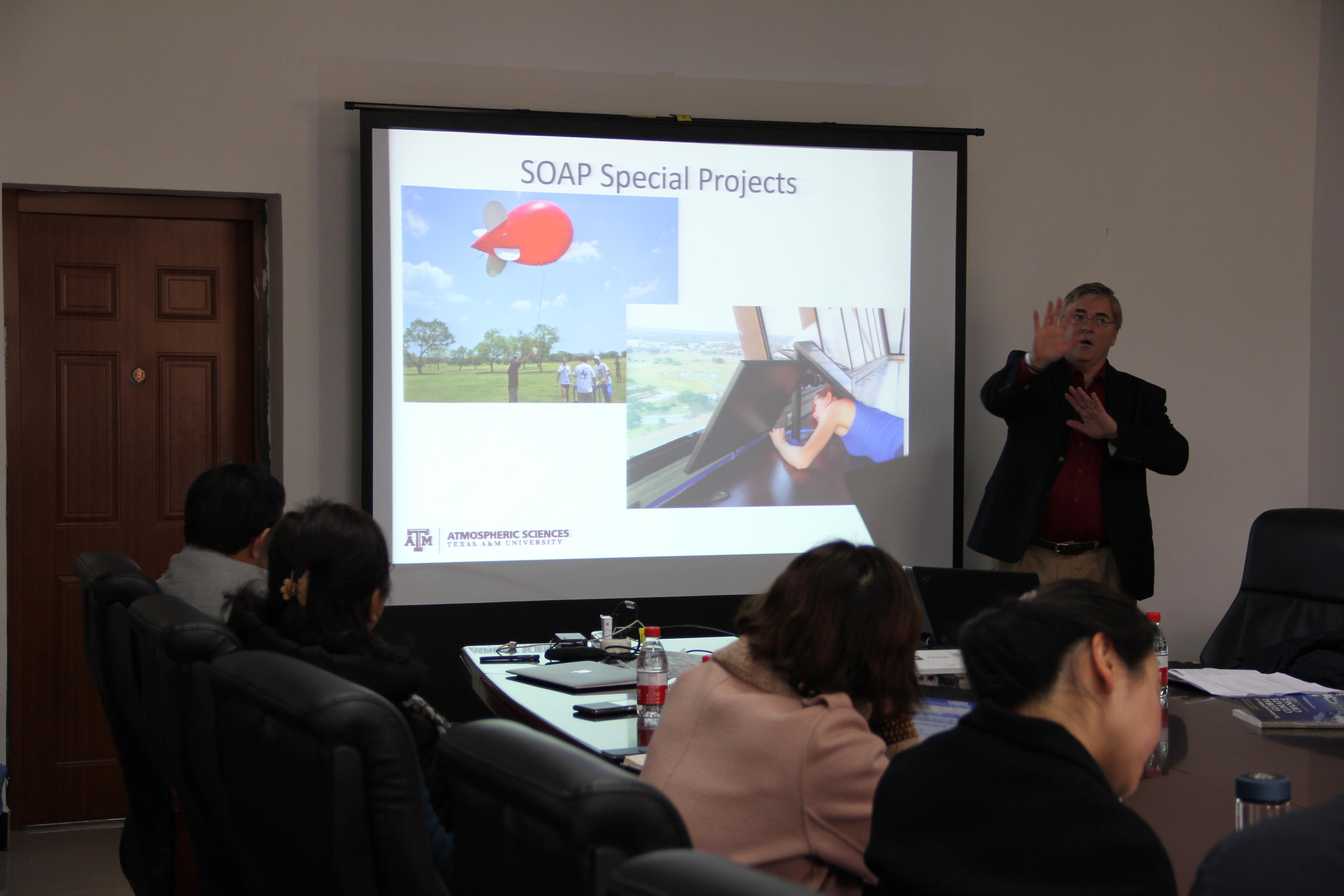 Don Conlee博士带来了主题为“High-Impact Meteorology Education at Texas A&M”的报告,为在座师生介绍了A&M大学大气科学系对学生的培养过程和培养重点,并用大量图片展示了大气科学系的学生们在观测站实际观测和考察的情形,教学方式丰富多样,令学生乐在其中。