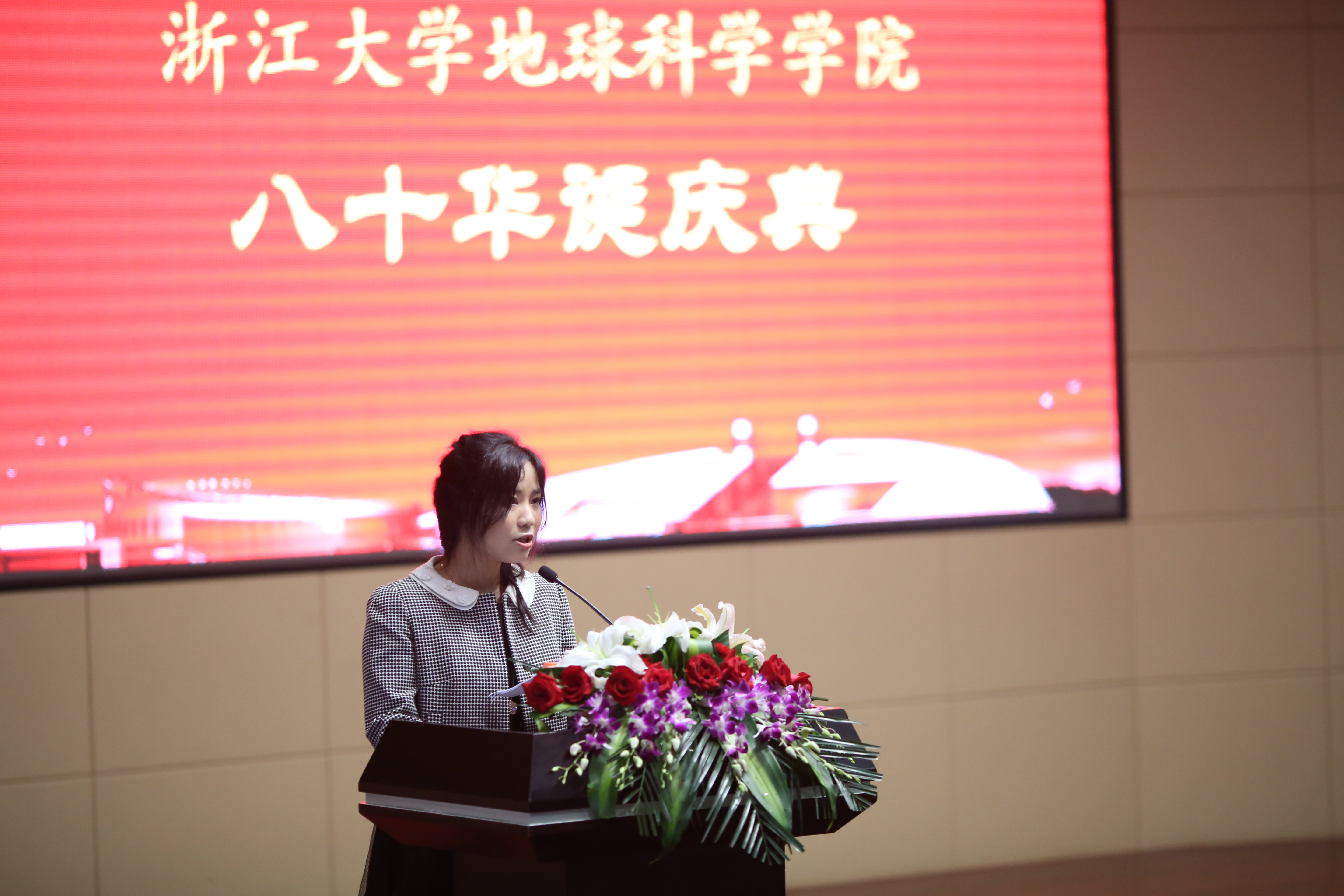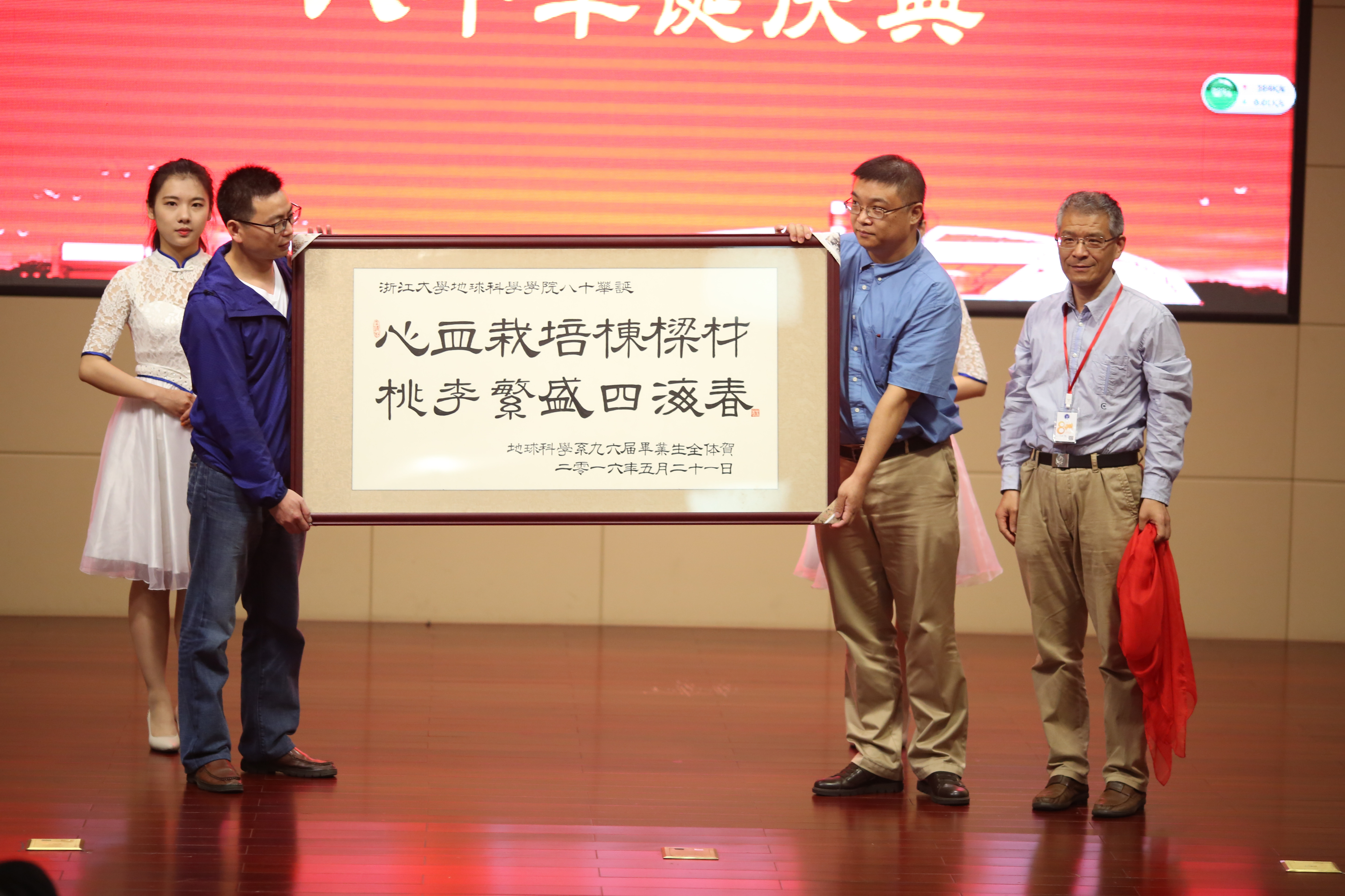 庆典大会上,校友代表88届地质专业吴能友研究员、在职教师代表76届大气科学专业翟国庆教授、在校学生代表15级人文地理专业博士研究生张天舒同学依次上台发言;96届地质班还向学院赠送了写有“心血栽培栋梁材,桃李繁盛四海春”的书扁,副院长沈忠悦教授代表学院接收了礼品;随后4位教师代表方龙龙、陈宁华、苏程、黄道朗诵了best365官网人文地理范今朝老师创作的诗词《浙大地学赋》,把大会的气氛推向了高潮。他们热情洋溢的演说和感人至深的举动,都透露出他们对于学院的深厚的感激之情和眷恋之意。