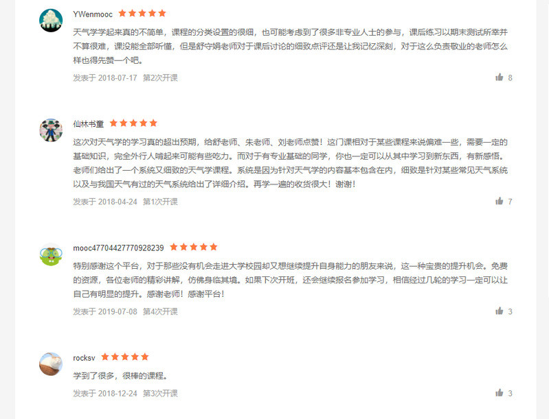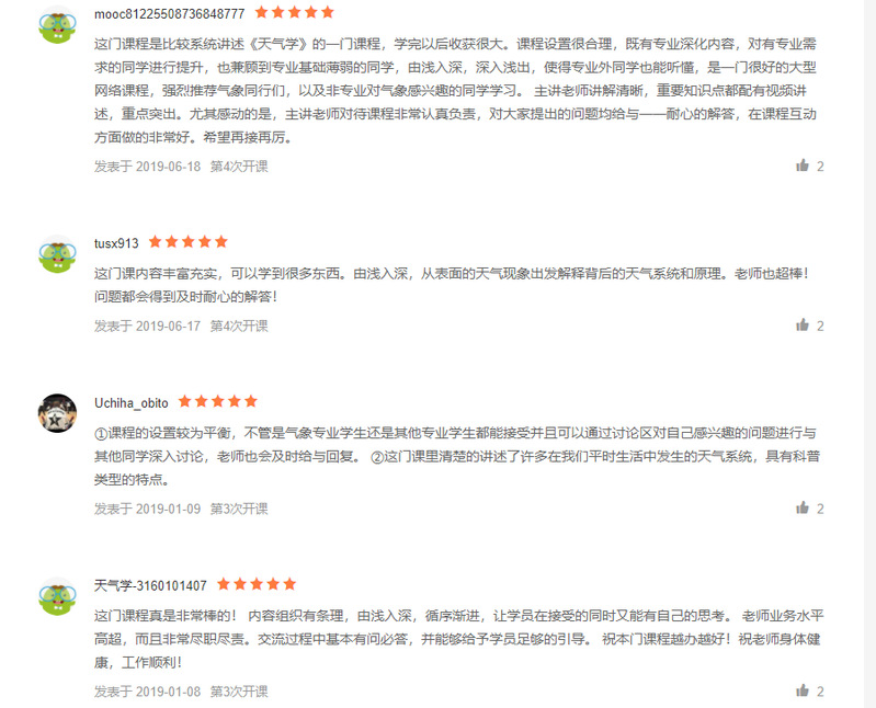 该慕课课程的学员,有的获得了全国地球科学奥林匹克竞赛和国家队选拔赛冠军,有的代表中国队获得国际地球科学奥林匹克竞赛(IESO)金牌,有的是全国地球科学大赛的指导老师,有的借助课程资源考上心目中理想的高等学府,课程得到广大学友的充分肯定。在2020年新冠疫情期间,课程团队积极为“战疫”助力,为全国十余个省份的“世界气象日”大型活动提供优质线上资源,保障了疫情期间大气科学科普宣传的正常进行,扩大了best365官网登录入口地科学院的社会服务范围和影响力。