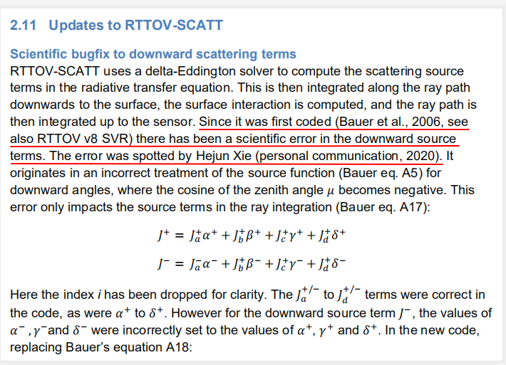 这两个错误,一个是程序功能实现上的错误,一个是云雨区辐射传输核心模块算法上的错误。后者埋藏了整整16年无人发现,基于此错误算法的研究数据也可能存在误差或错误。随后他向开发者国际著名云雨区卫星资料同化专家、欧洲中期天气预报中心的Alan Geer博士进行了反馈和汇报。Alan Geer找到了多年前的研究笔记,亲自推演公式证实了谢和俊的发现是正确的。