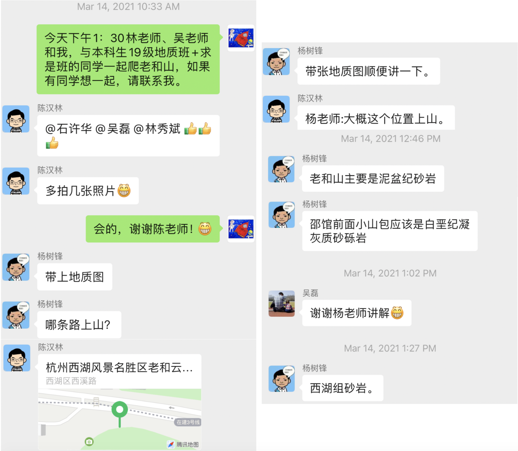 杨树锋院士、陈汉林教授对本次游学活动的开展进行了指导,副院长程晓敢(兼求是地质1901班班主任)为同学们提供了杭州地区的地质图。吴磊、林秀斌两位老师计划在活动过程中结合课程所学内容为同学们讲解老和山、西湖的地质概况和构造成因,以及与之有关的华南构造演化历史。