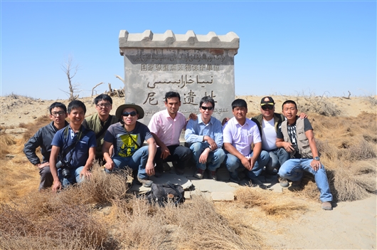 塔克拉玛干沙漠中尼雅古城遗址(右四为杨小平)。作者供图