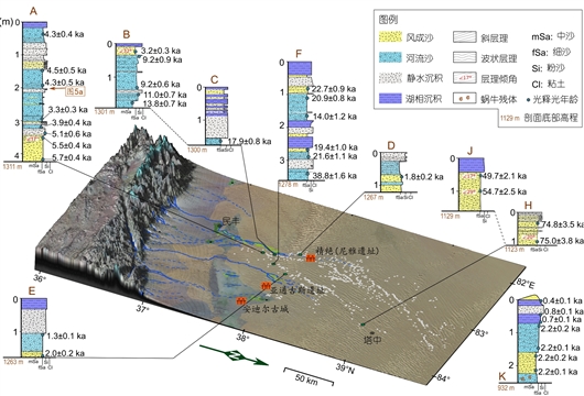 从2015年至今,研究团队对塔克拉玛干沙漠中西部南北大断面进行了广泛的遥感调查和地貌学考察,并以沉积地层学为基础,对9个典型的河流-湖泊-风沙沉积剖面开展了全面系统的研究。