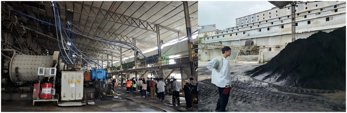 图8所示是铬铁矿矿石分选的机器及分选后的精矿堆。矿石经过机器翻转搅拌,充分粉碎后运往摇床。摇床根据矿石的密度,通过多层振动分流,将铬铁矿与其他矿石和基质分离。分选后的晶矿中,二氧化铬含量可以达到接近50%。